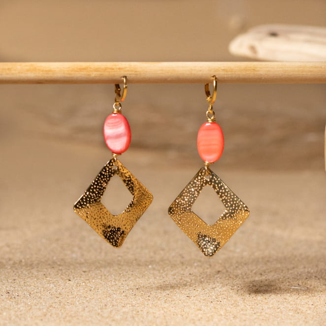Égayez vote quotidien avec les boucles d'oreilles Sospel. Composées d'une perle ovale en nacre rose et d'un pendentif carré en métal doré, ces boucles fantaisie apportent une touche de fun et de vitalité à n'importe quelle tenue. Évoquant l'esprit des vacances estivales au bord de la mer, elles incarnent la gaieté et la légèreté des journées ensoleillées. Ces boucles pleines de vie subliment chaque tenue, en ajoutant une note chic et estivale.