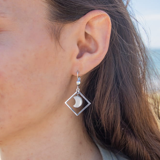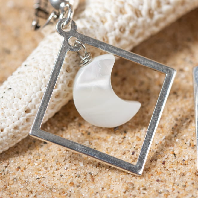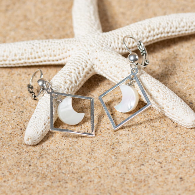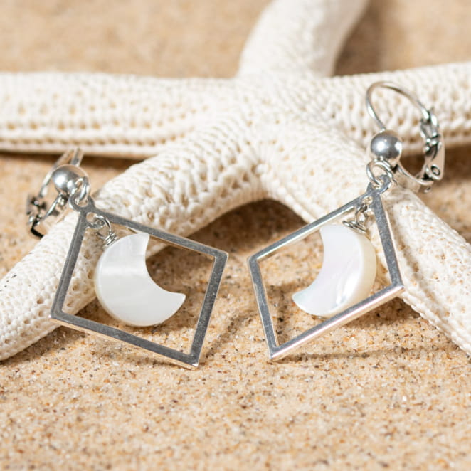 Découvrez l'éclat délicat des boucles d'oreilles Soues. Dotées d'un pendentif carré argenté et d'une lune en nacre blanc, elles incarnent l'harmonie entre modernité et douceur. Le contraste subtil entre l'argent et la nacre crée une esthétique envoûtante, parfaite pour une touche d'élégance à toute tenue.