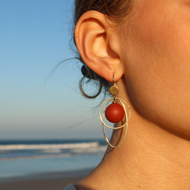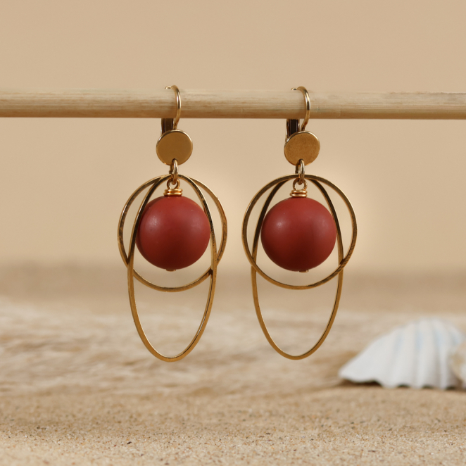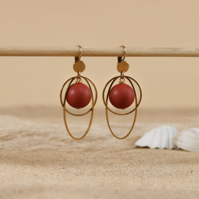 Sublimez vos oreilles avec les boucles d'oreilles Tanina, des pièces originales et modernes ! Ce bijou pour femme incarne originalité et caractère grâce aux anneaux ovales dorés et la boule en résine rouge qui est englobée tel le soleil couchant sur le rivage. Les boucles d'oreilles pendantes apportent style et accessoirisent facilement toutes les tenues pour toutes les occasions.