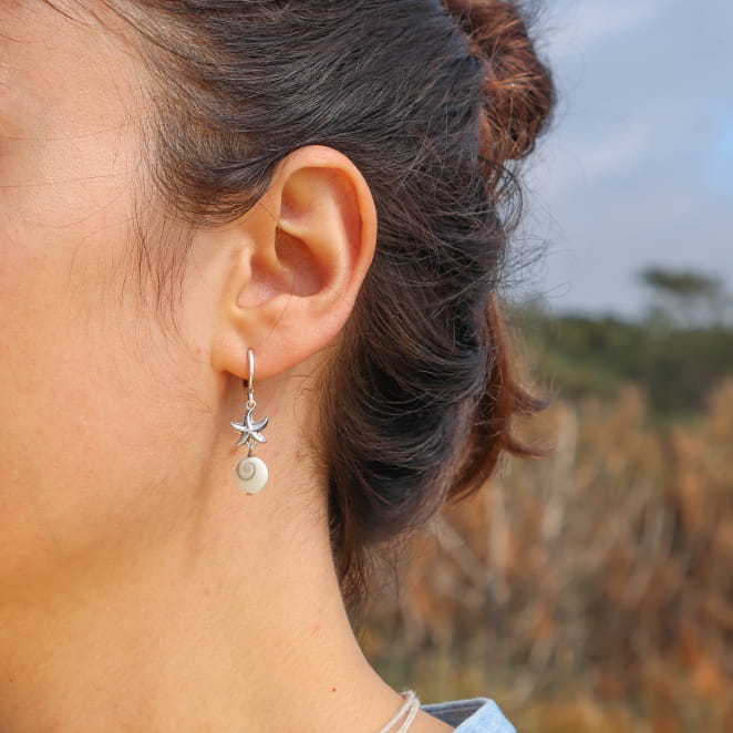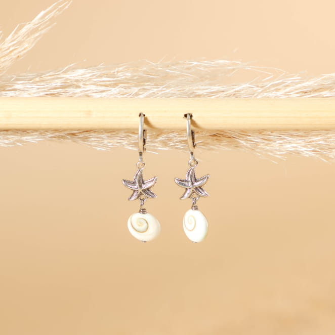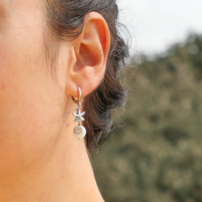 Découvrez les boucles d'oreilles Tongatapu, inspirées par la douceur des vagues, où les dormeuses rondes en métal plaqué argent 999 rencontrent des pendentifs étoiles de mer et des perles en œil-de-sainte-lucie beige, pour un style lumineux et naturel.
