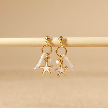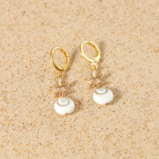 Découvrez les boucles d'oreilles Tongatapu, inspirées par la douceur des vagues, où les dormeuses rondes en métal doré à l'or fin 24K rencontrent des pendentifs étoiles de mer et des perles en œil-de-sainte-lucie beige, pour un style lumineux et naturel.