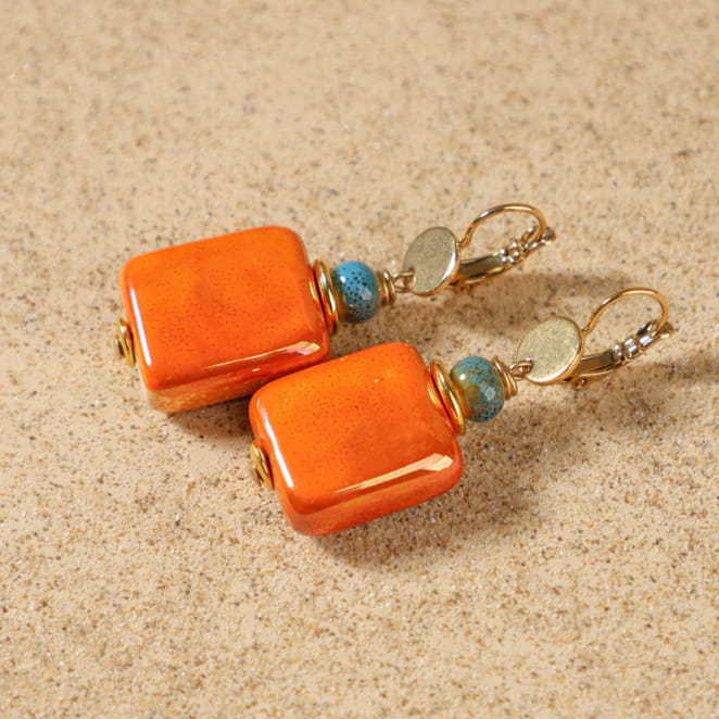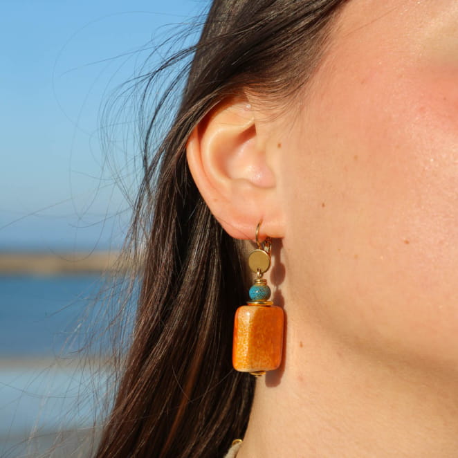 Avec son esprit à la fois brut et raffiné, la paire de boucles d'oreilles Toulon, doré est un hommage aux couleurs ensoleillées des rivages. Il se pare d'une perle en céramique carrée aux nuances vibrantes orange et d'une perle en céramique ronde bleue. Le délicat éclat doré vient sublimer l'ensemble, ajoutant une touche de lumière inspirée des couchers de soleil sur la mer. Un bijou à la fois artisanal et sophistiqué.