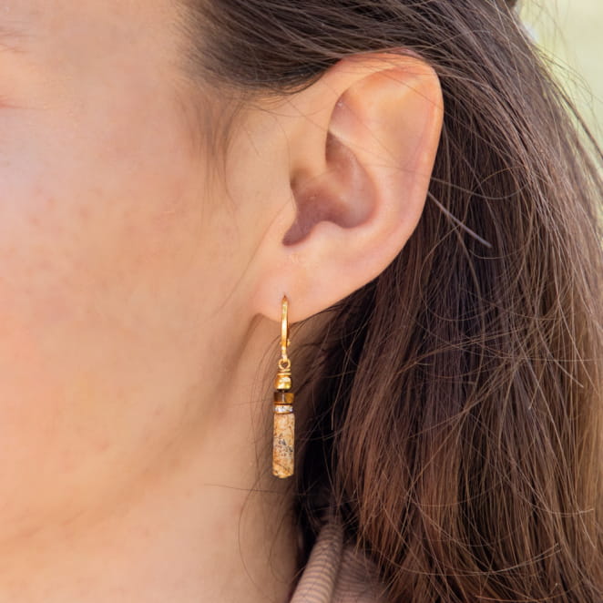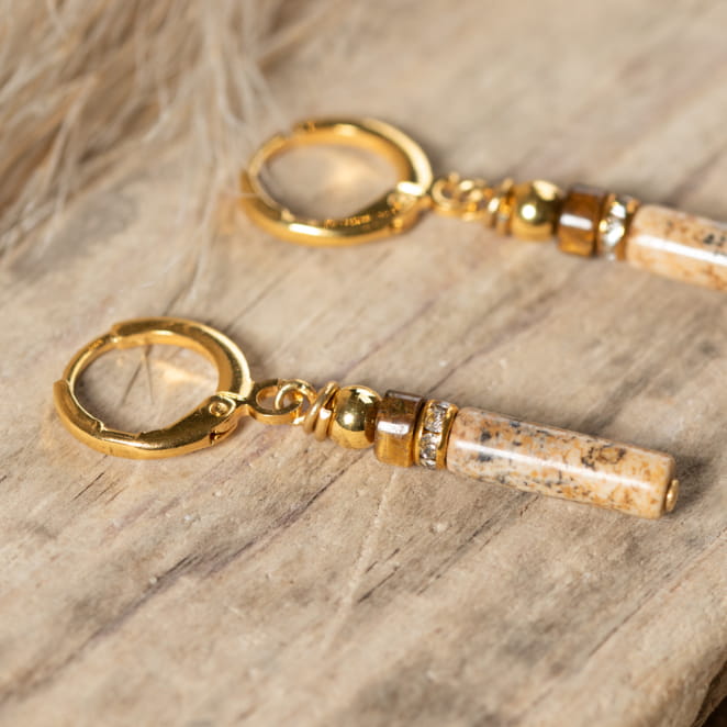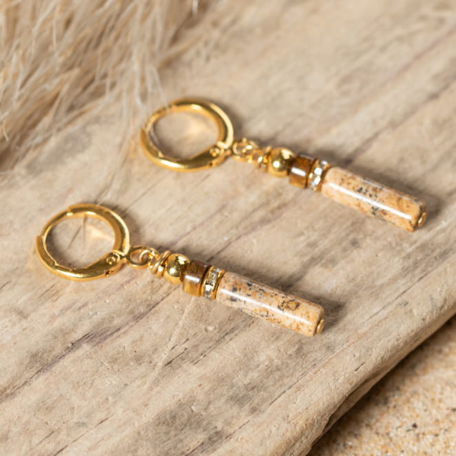 Sublimez votre allure avec les boucles d'oreilles Trésor : ces boucles pendantes dorées attirent le regard avec une pierre de jadéite beige en forme de tube, accompagnée d'une perle rondelle en pierre marron et des strass étincelants. voir plus
