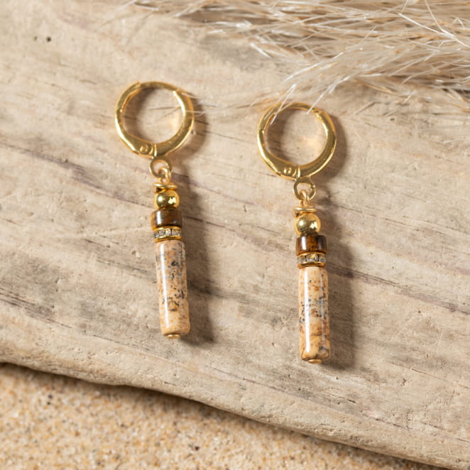 Sublimez votre allure avec les boucles d'oreilles Trésor : ces boucles pendantes dorées attirent le regard avec une pierre de jadéite beige en forme de tube, accompagnée d'une perle rondelle en pierre marron et des strass étincelants. Offrant une touche d'élégance et de luminosité, elles rehausseront votre style avec raffinement et éclat.