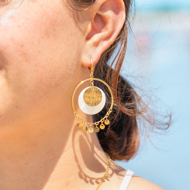 Optez pour un style bohème avec nos boucles d'oreilles doré Tzigane. Composées de nacre et de métal doré, ces boucles d'oreilles sont indispensables pour rehausser une tenue !