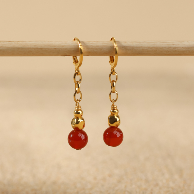 Apportez éclat avec les boucles d’oreilles Venezia terracotta. Ces créations artisanales mêlent l’agate rouge créant des reflets chauds, à des perles et une chaîne dorées à l’or fin 24K. Leur style évocateur du naturel en font des accessoires uniques pour sublimer vos tenues avec une touche d’évasion. Parfaites pour celles qui aiment les bijoux lumineux, cespièces pour femme apportent une harmonie avec ces délicats matériaux. Légères et faciles à porter au quotidien !