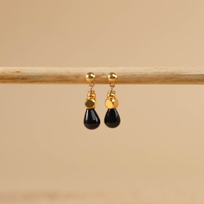 Découvrez ces boucles d’oreilles Vero, une création lumineuse où le noir profond des pendentifs en verre se marie délicatement avec l’éclat doré des perles et des poussettes. Inspiré par la mer et la douceur des vacances, ce bijou apporte une touche d’évasion à chaque instant. Les matériaux, soigneusement choisis, évoquent la simplicité et l’artisanat, pour un accessoire aussi unique que vos souvenirs estivaux.