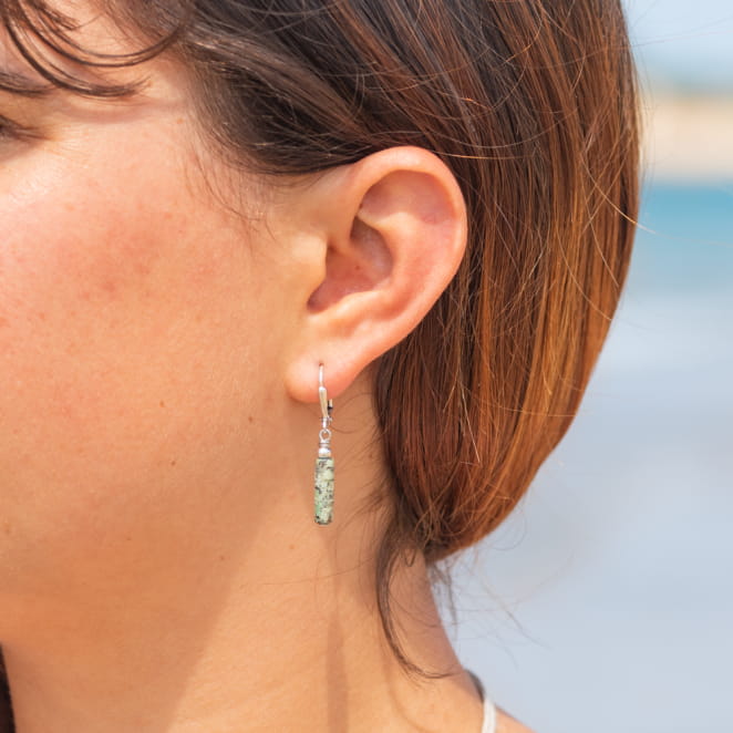 Laissez-vous envoûter par l'alliance parfaite entre la simplicité et l'élégance des boucles d'oreilles Wakame pour une allure subtilement chic. Accrochées à des dormeuses argentées, ces bijoux captivants arborent des perles tubes en pierre verte. Leur design minimaliste fusionne avec l'éclat naturel de la pierre pour offrir une touche de sophistication discrète.