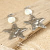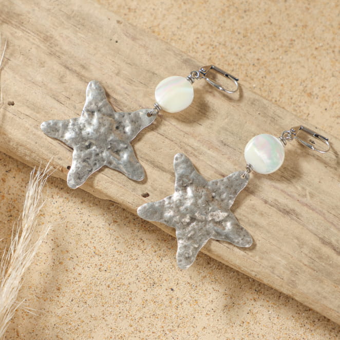 Admirez les boucles d’oreilles Yseline, où étoiles de mer en métal argenté et perles de nacre blanche se rencontrent. voir plus