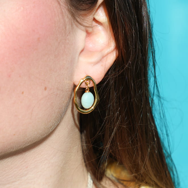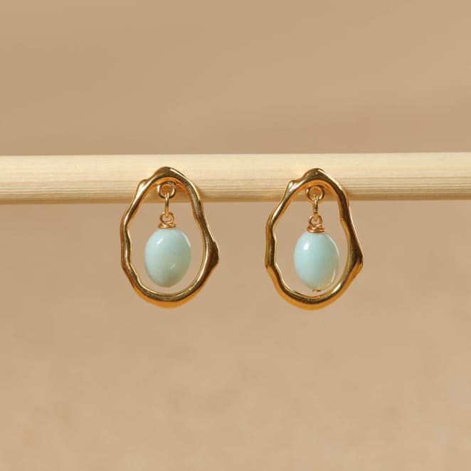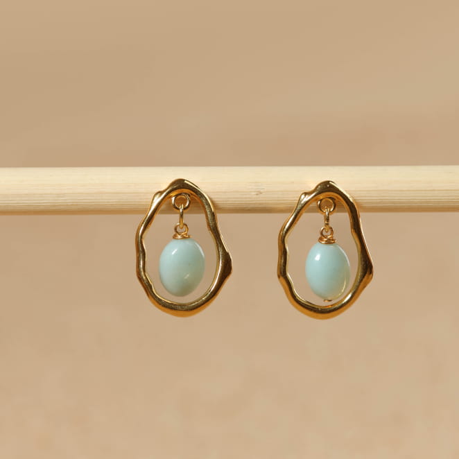 Découvrez notre paire de boucles d'oreilles Zelda : une création artisanale pour femme dorées composées d'une perle en amazonite et d'un pendentif oval doré. La perle en pierre naturelle bleue rappelle les douces couleurs du bord de mer, de l'océan et des jolis reflets bleus. Cette paire de obucles d'oreilles pour femme est facile à porter tous les jours pour ajouter une touche délicate à votre style !
