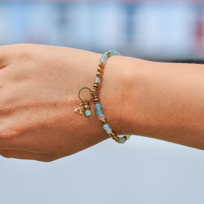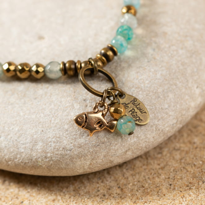 Le bracelet Abysse accorde de magnifiques perles de couleurs en hématite bronze et en pierre bleue qui viennent ajouter de l'éclat au pendentif en forme de poisson en métal bronze. Un bijou fantaisie fin et délicat qui apporte une petite touche de couleur discrète à votre poignet !