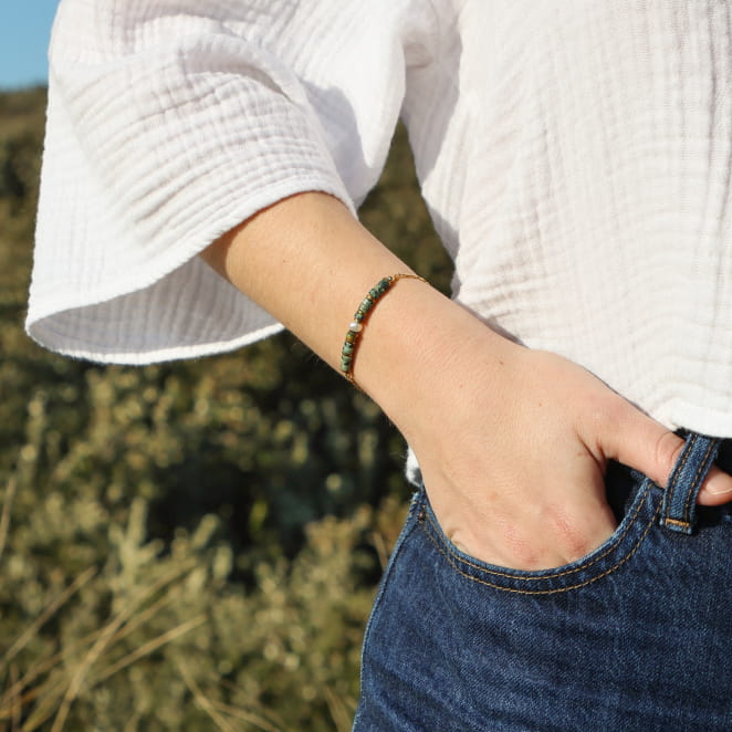 L'élégant bracelet Alchimie apportera de la délicatesse et de l'originalité à votre poignet au quotidien avec ses pierres en turquoise africaine, sa perle de culture de rivière blanche et ses rondelles en hématite doré. Chacune des pierres de ce bracelet est différente, ce qui permet de le rendre unique !