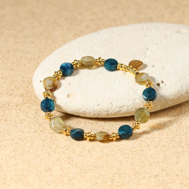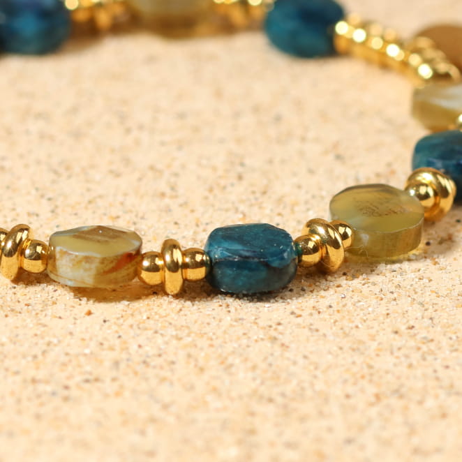 Plongez dans l’univers apaisant et lumineux de notre bracelet pour femme Alicia, les perles dorées s’unissent aux perles en agate verte et aux perles en apatite bleue. Ce bijou est une invitation au voyage, ses perles aux jolis reflets vous ramène au bord de la côte Ouest, mêlant l’éclat chaleureux et la fraîcheur des pierres naturelles.