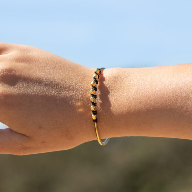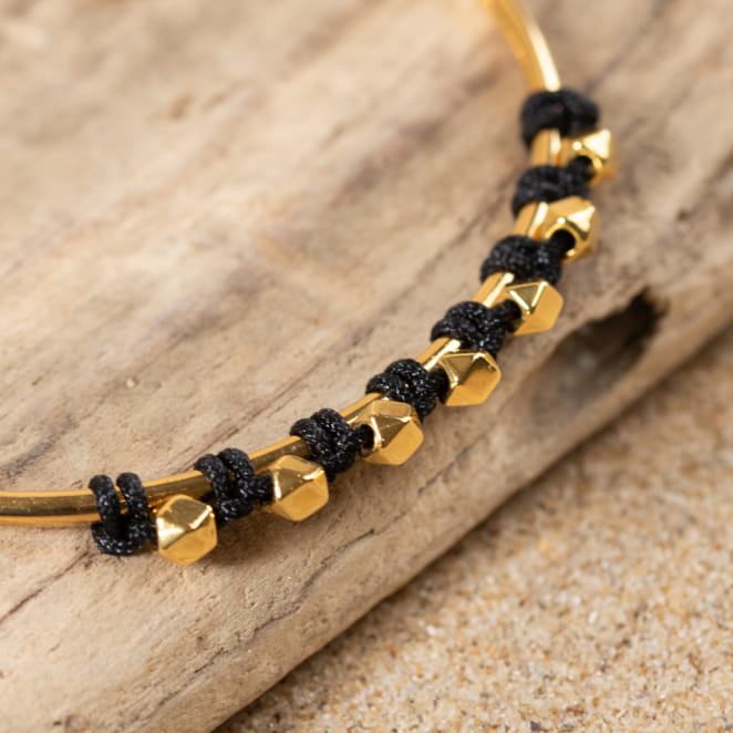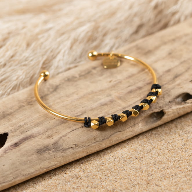 Explorez l'élégance intemporelle avec le bracelet pour femme Allure. Ce jonc doré présente un tressage délicat de perles dorées, accentué par un cordon noir pour une sophistication subtile. Polyvalent et chic, ce bracelet est le choix parfait pour compléter votre look quotidien avec une touche de style distinctif.