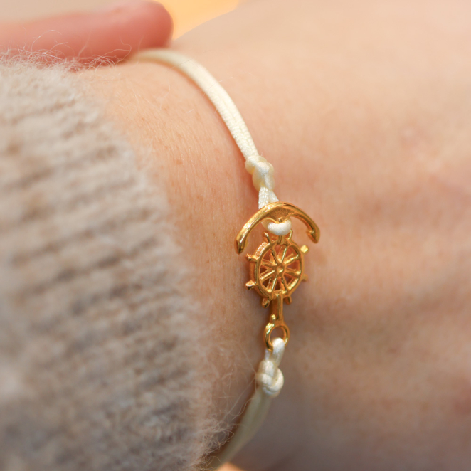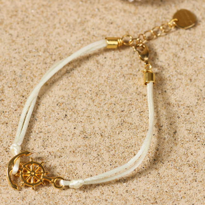 Apportez une touche marine à votre quotidien avec le bracelet Alphée. L’ancre, symbole d’espoir et de stabilité, est sublimée par une finition dorée lumineuse. Le cordon blanc crème s’adapte à votre poignet avec sa chaînette de réglage, pour un confort optimal. Il peut se porter seul ou en accumulation avec d’autres bracelets. Un cadeau idéal pour les amoureux de la mer ou pour vous-même, il vous accompagnera dans toutes vos escapades, rappelant la liberté et l’évasion. Offrez-vous un bijou intemporel qui fait voyager 🌊⚓