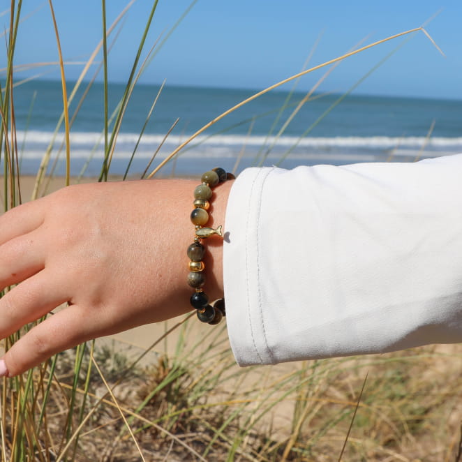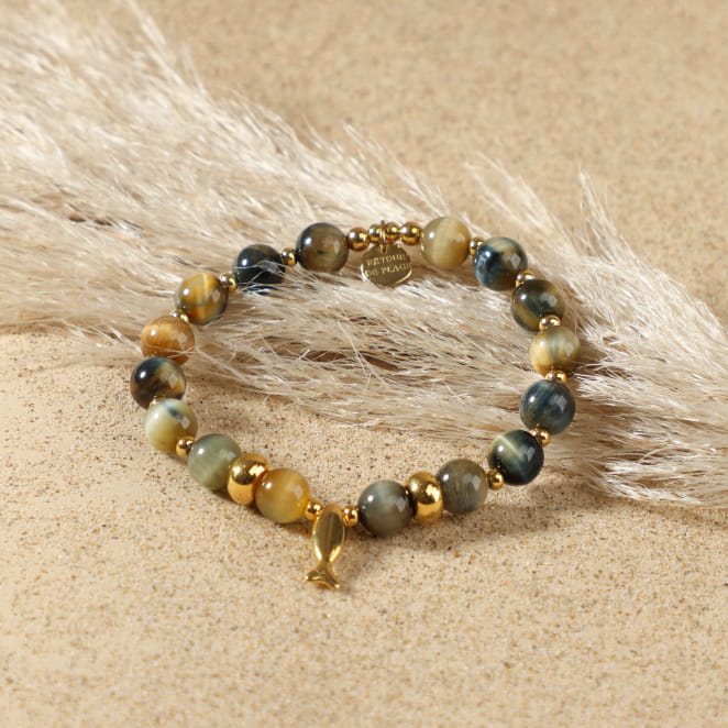Notre bracelet pour femme en perles : Aquarium, reflète toute la beauté du bord de mer. Ses petites perles dorées captent la lumière avec éclat, tandis que les perles naturelles en agate apportent une touche colorée et marine nous rappelant l'univers marin. Le pendentif en forme de poisson doré à l'or fin 24 carats, symbole emblématique de l’océan, ajoute de l'originalité à votre tenue. Notre bracelet pour femme est un intemporel qui habille le poignet d’une touche marine subtile.