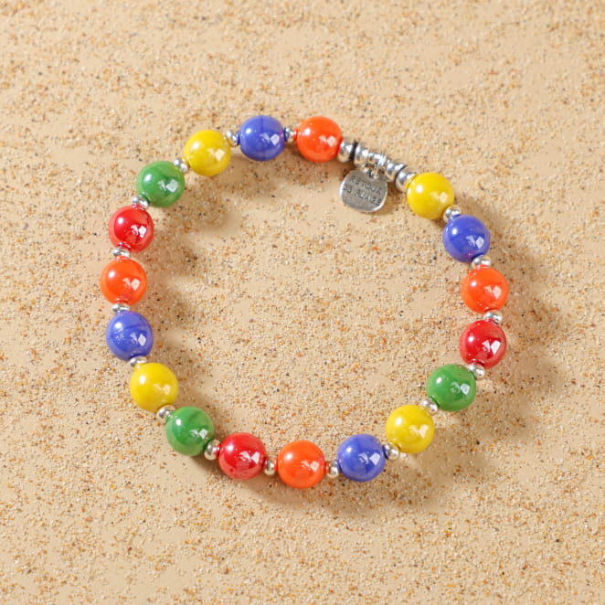 - de perles en verre rouge, vert, bleu, jaune et orange,