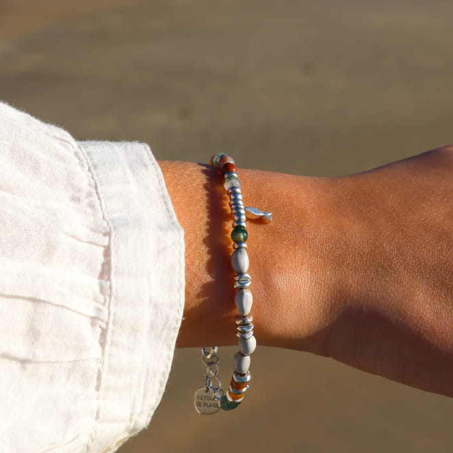 Découvrez notre bracelet pour femme Avocette : composé de petites perles en agate multicolore, de perles argentées et de perles en graine grises et son pendentif en forme de poisson, ce bracelet pour femme apporte de la douceur et de l'éclat à votre tenue de tous les jours ! Avec ses jolies couleurs, il s'adaptera facilement à d'autres bijoux pour créer une accumulation délicate.