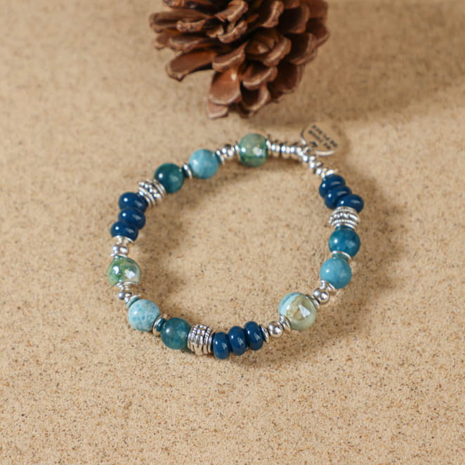Le bracelet Azureen capturent la profondeur des eaux avec une élégance toute naturelle. Ce bracelet en perles aux nuances de bleu évoque les profondeurs de l'océan et les vagues qui caressent le rivage. Chaque perle, est unique par sa teinte et sa texture. Léger et inspiré par les horizons marins, il est l'accessoire parfait pour insuffler une touche d'évasion à vos tenues.