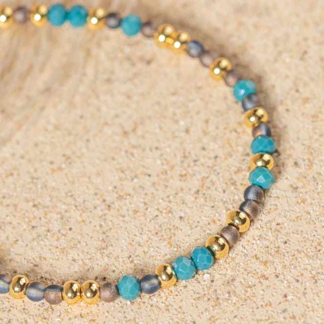 Craquez pour le bracelet Balisier, en doré, rehaussé de petites perles dorées et de perles bleu pétrole. Un accessoire fin et élégant, idéal pour sublimer vos tenues avec une touche de couleur discrète et raffinée.