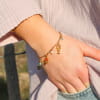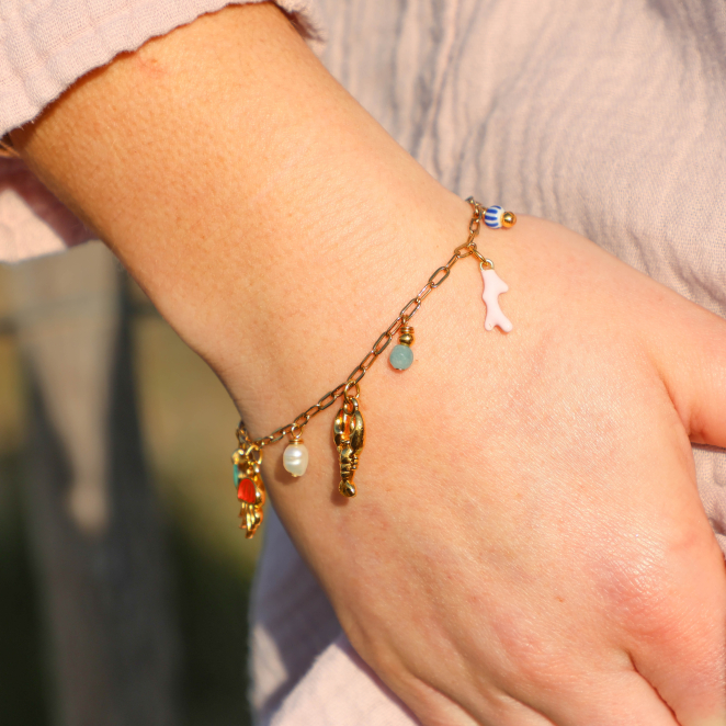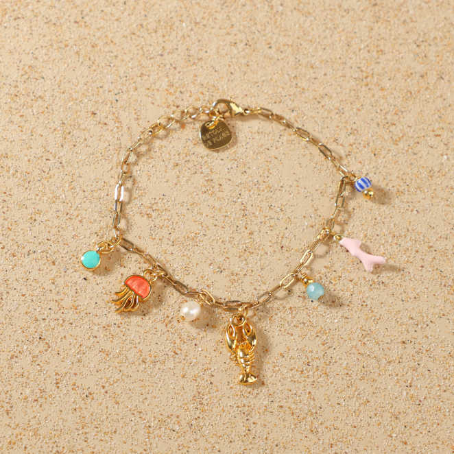 Avec ses petites breloques inspirées de la mer, le bracelet Bandeloro est un concentré de vacances ! On y retrouve un homard doré, une méduse corail, une perle nacrée, un coquillage, du bleu, du turquoise… tout un petit monde marin embarqué sur une jolie chaîne dorée. Léger et plein de peps, il se porte aussi bien en journée qu’en soirée. Un bijou joyeux, comme un trésor ramassé sur le sable !