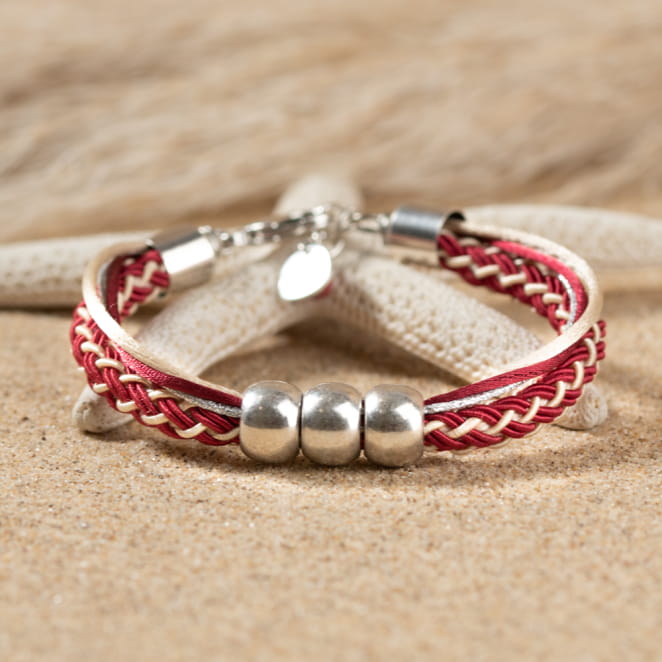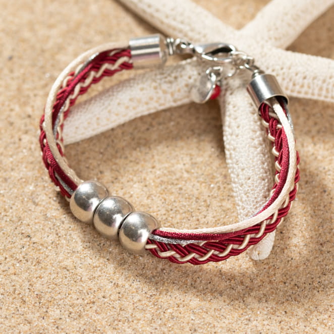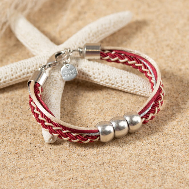 Le bracelet Bayonne séduit par son design multibrins unique, mêlant perles argentées et cordons rouge et beige. voir plus