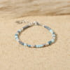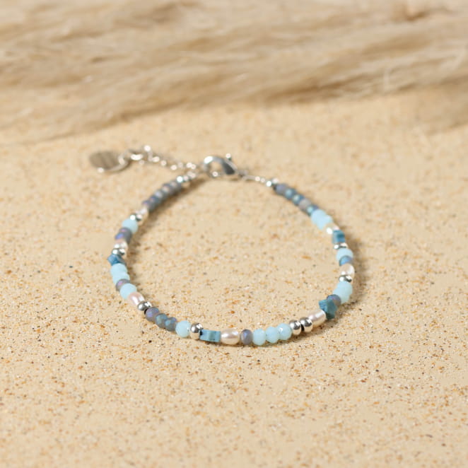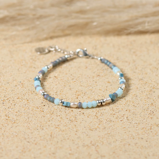 Retrouvez la sérénité du bord de mer avec ce bracelet pour femme Berger, où se mêlent perles en verre bleues, une perle en forme d’étoile en howlite bleu, et des perles de rivière blanches. Ce bijou artisanal, apporte une touche d’évasion et de douceur à votre poignet.