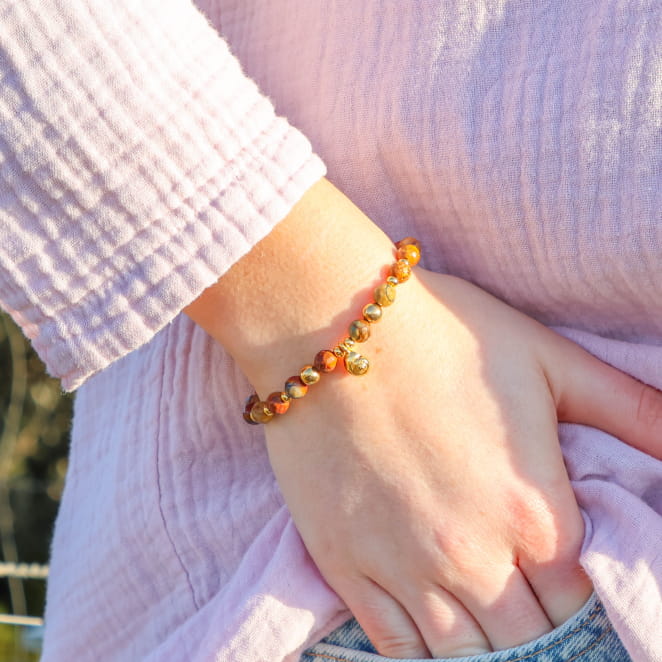Découvrez le bracelet Bigorne, symbole d'élégance. Ses perles en pierre aux tons marron se marient harmonieusement avec le métal doré du pendentif bigorneau et des perles boules. Une pièce raffinée qui ajoute une touche sophistiquée à votre tenue.