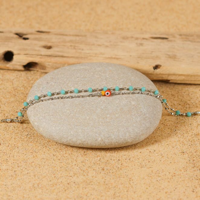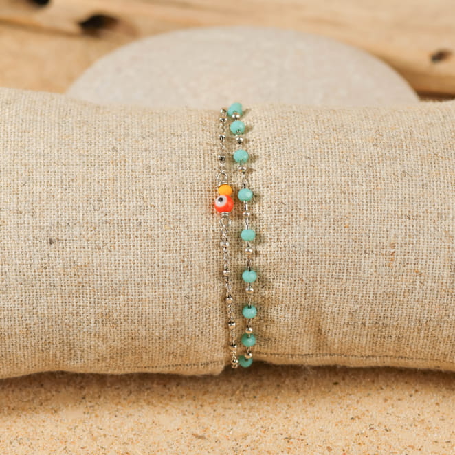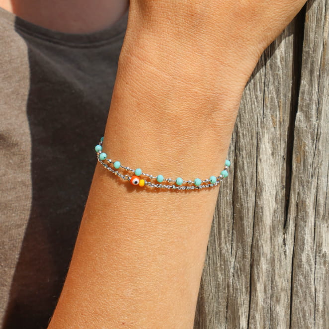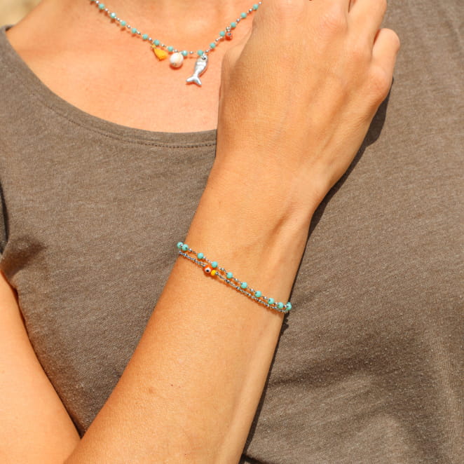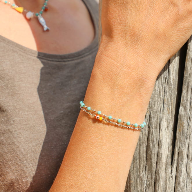 Optez pour notre bracelet pour femme Bonita pour ajouter une touche délicate et colorée à votre tenue. Sa double chaîne mêle l’éclat argenté à la douceur de petites perles bleues claires, évoquant la transparence des vagues sous le soleil. Les deux perles colorées, l’une orange et l’autre jaune, viennent ponctuer le bijou comme des éclats de lumière, apportant une touche joyeuse et solaire à votre poignet. Léger et raffiné, il s’accorde aussi bien avec un look décontracté qu’avec une tenue plus habillée.