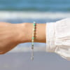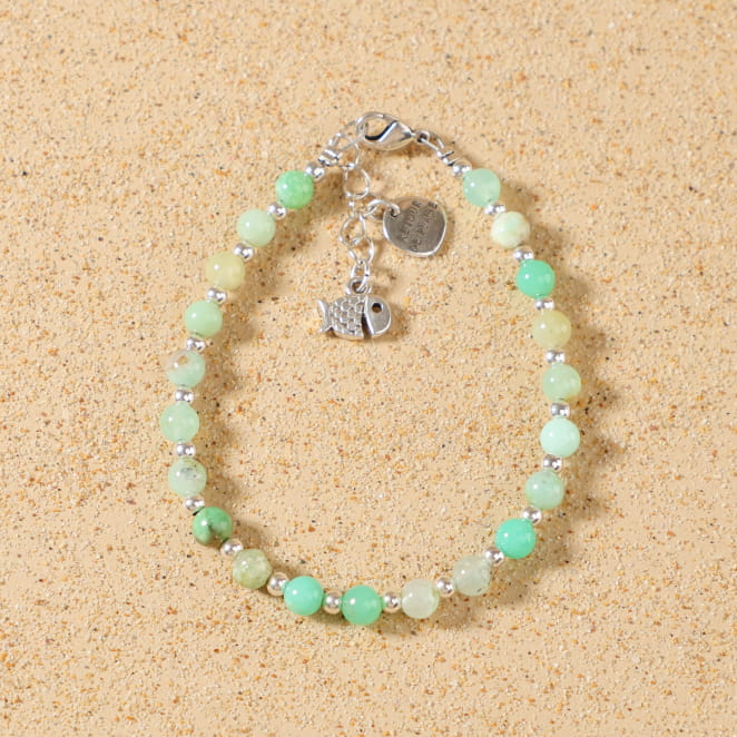 Laissez-vous porter par l’élégance naturelle de ce bracelet femme Borki, où le vert apaisant de la chrysoprase rencontre l’éclat intemporel de l’argent. Ce bijou artisanal allie des perles le vert apaisant à un pendentif poisson, symbole d’évasion. Parfait pour celles qui aiment les pièces lumineuses et pleines de caractère.