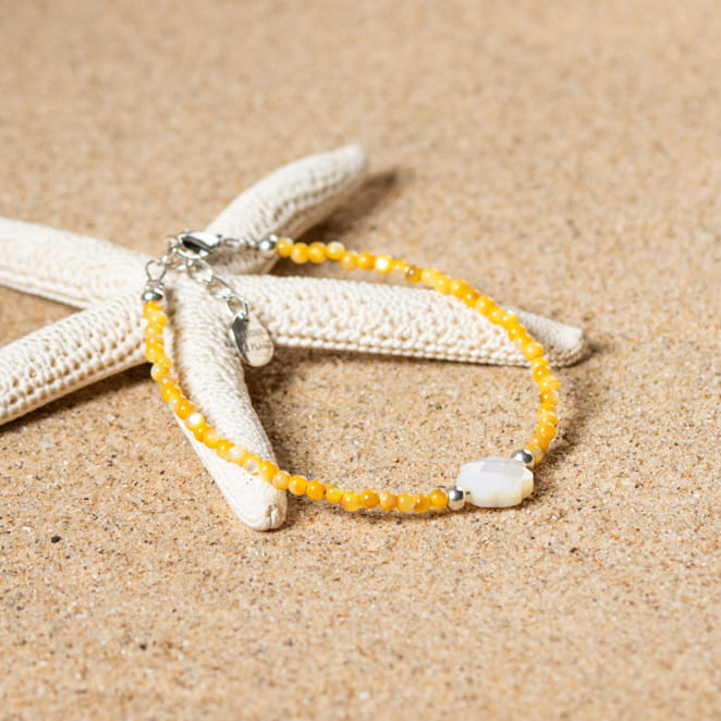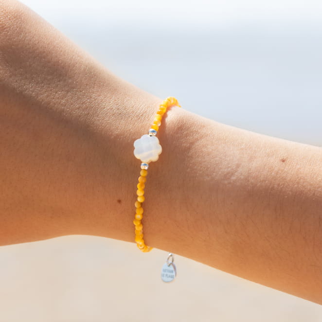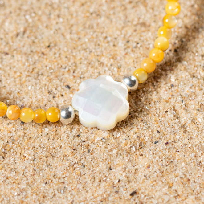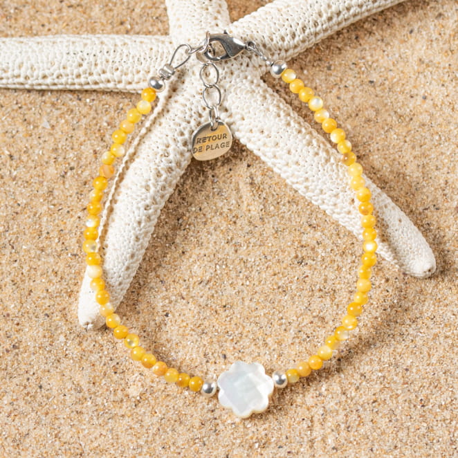 Illuminez votre style avec le bracelet Bouton ! Composé de petites perles boules en nacre jaune, il se distingue par une perle en forme de fleur en nacre blanche. Ce bijou apporte couleur et lumière à votre poignet, parfait pour égayer toutes vos tenues.