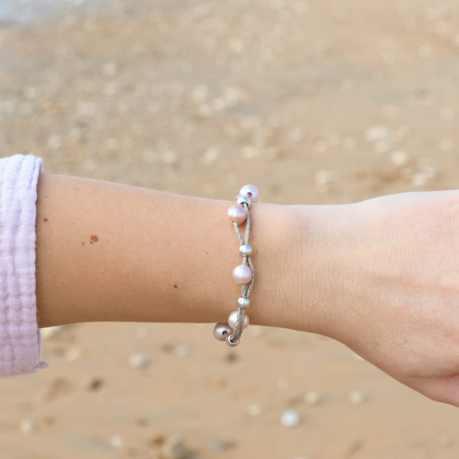 Découvrez le bracelet cordon pour femme Bréhat, une élégance naturelle à vos poignets ! Composé de cordons en lin beige ornés de perles en métal plaqué argent et de perles de rivière roses pales, il allie raffinement et simplicité. Parfait pour une touche de sophistication discrète, ce bijou sublime votre style avec une note bohème et chic.