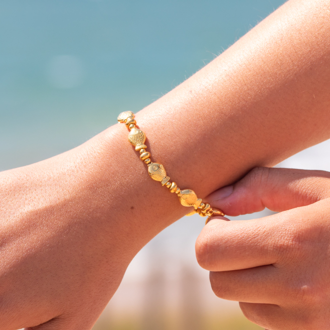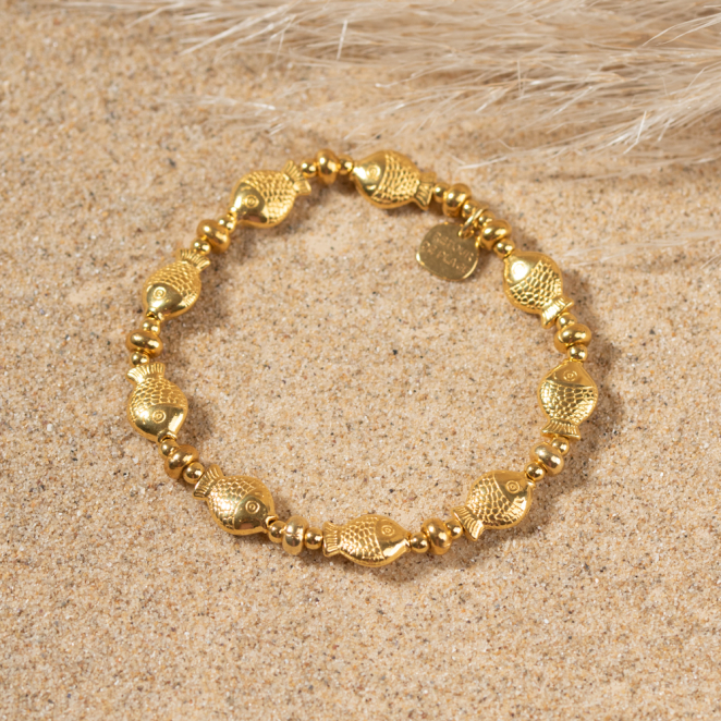 Le bracelet pour femme Brème, avec ses perles dorées en forme de poissons, est une véritable ode à la mer. Inspiré par l'océan, ce bijou délicat et élégant apporte une touche marine à votre style. Parfait pour les amoureuses de la mer, il ajoute une note de fraîcheur et d'originalité.