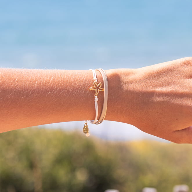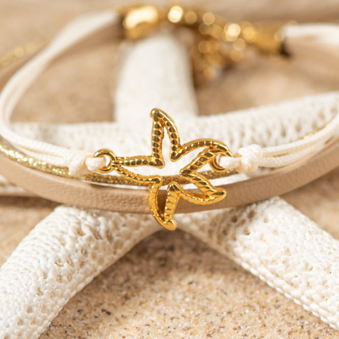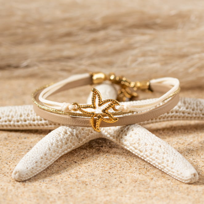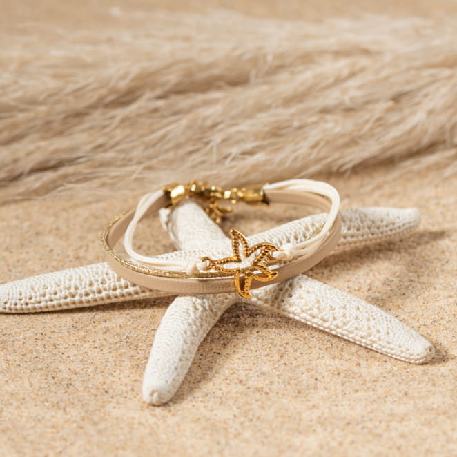 Ce bracelet Breton aux délicates nuances beige et de doré vous rappellent de jolis souvenirs de balade en bord de mer en Bretagne. Fin et élégant, ce bijou multi rangs s'accorde facilement avec tous vos looks.
