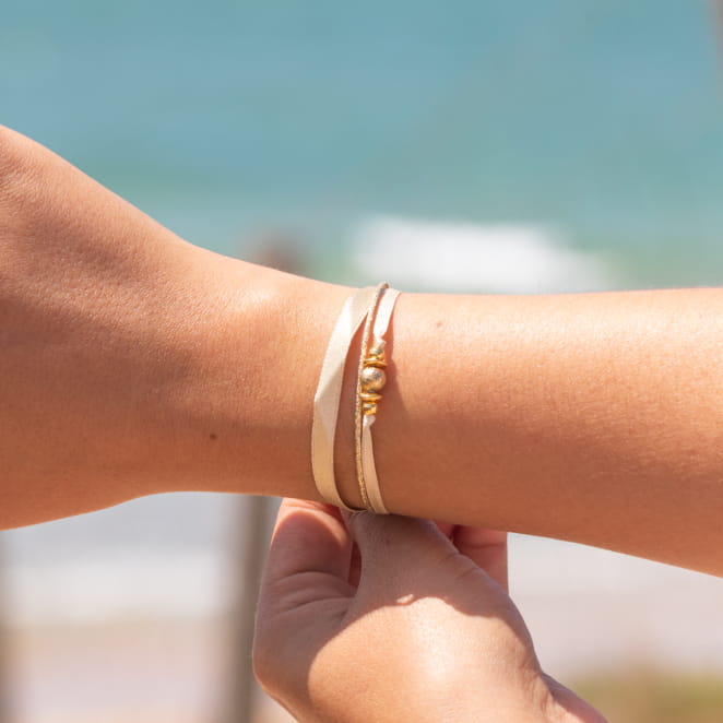 Le bracelet multibrins Brillant incarne l'éclat à l'état pur. Comme son nom le décrit si bien, ce bracelet brille de mille feux à travers ses perles en métal doré, son cordon doré et ses fils en satin beige. Il combine l'audace du doré avec la subtilité du beige pour créer un accessoire chic et polyvalent ajoutant une touche éblouissante à votre style.