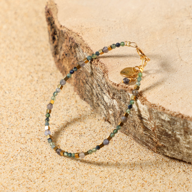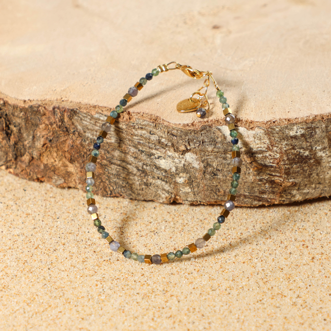 Laissez-vous envoûter par les couleurs pétillantes du bracelet Cachette. Avec des perles en cyanite, hématite et cordiérite, cette création évoque la fête et la joie d'un instant au bord de l'océan. Ce bijou scintille avec élégance et rappelle le pétillement des soirées d'été. Ce bijou est une composition douce et lumineuse, où les nuances de bleu et de doré se marient parfaitement, pour un effet à la fois naturel et sophistiqué. Ce bracelet est le compagnon idéal pour illuminer votre quotidien ou pour compléter une tenue de soirée avec une touche de raffinement. Offrez, à vous-même ou à vos proches, un peu de magie !