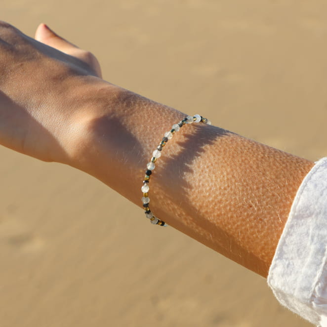 Adoptez au tour de votre poignet le délicat bijou Calypso, ce bracelet en perle pour femme se distingue par son métal en bronze le rendant original et démarquant. Les perles aux nuances variées de bronze, doré, gris et noir dansent autour du poignet. Le bracelet Calypso est léger et se marie parfaitement à toutes vos tenues, ce petit bijou sera votre indispensable pour une touche de modernité !
