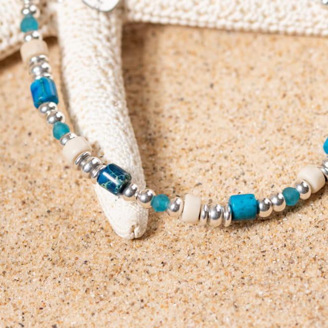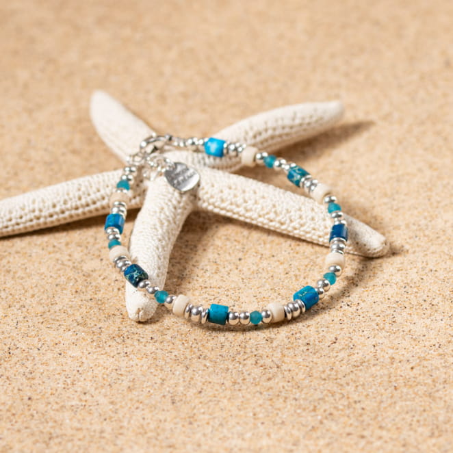 Le bracelet en perles Capu est un bijou élégant, composé de perles de jaspe impérial bleu, de perles en verre bleu, de perles argentées et de perles en albite beige. Ce mélange harmonieux de matériaux crée un accessoire unique, parfait pour ajouter une touche sophistiquée et naturelle à n'importe quelle tenue.