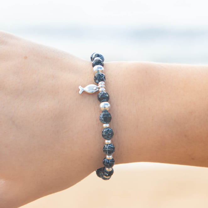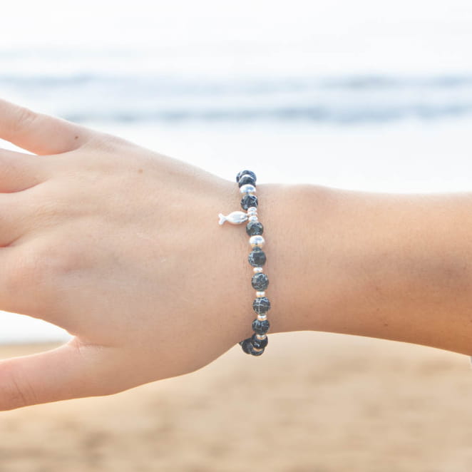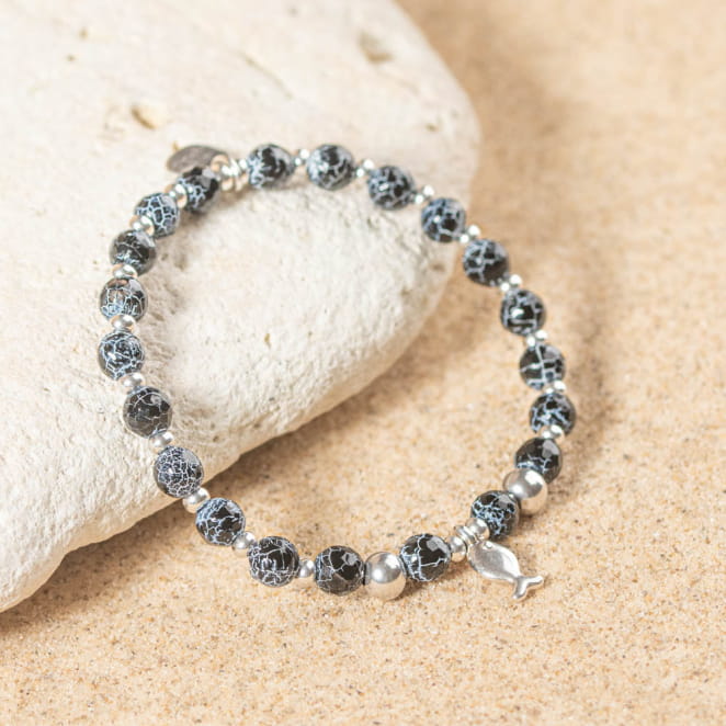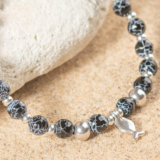 Plongez dans l'élégance intemporelle avec notre bracelet Cardine. Composé de perles noires marbrées rappelant la profondeur des fonds marins, il est subtilement ponctué de perles argentées pour un éclat discret mais captivant. Au centre, un petit poisson en argent vient se poser délicatement, symbole de liberté et d’aventure. Un bijou unique, à la fois chic et décontracté.