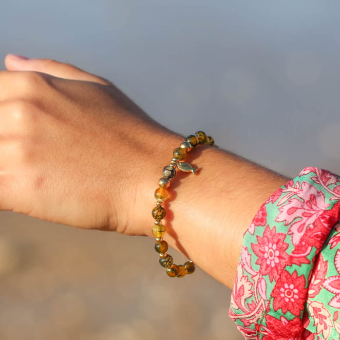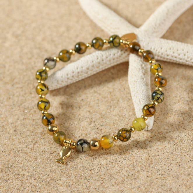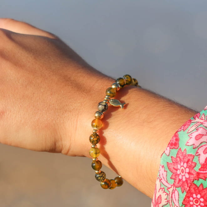 Le bracelet Cardine illumine chaque tenue avec ses perles d'agate jaune moutarde et en métal doré . Son charmant pendentif poisson évoque l'océan, tandis que le jaune rappelle les plages ensoleillées. Une fusion parfaite de style et de nature pour une touche éclatante à votre look.