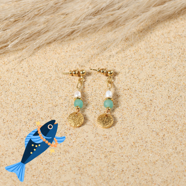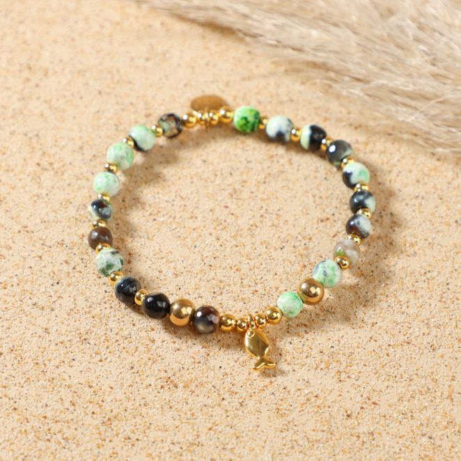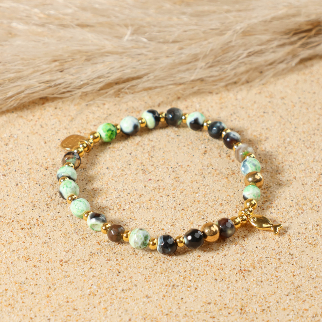 Le bracelet Cardine illumine chaque tenue avec ses perles d'agate vert et en métal doré. Son charmant pendentif poisson évoque l'océan, tandis que le vert rappelle le naturel du bord de mer. Une fusion parfaite de style et de nature pour une touche éclatante à votre look.