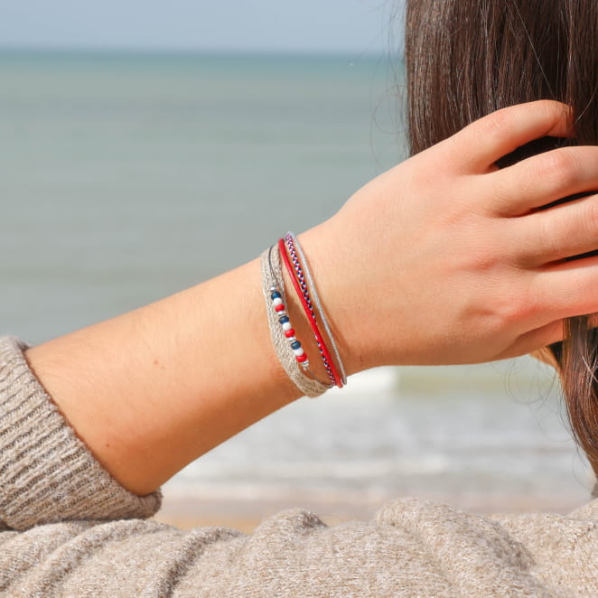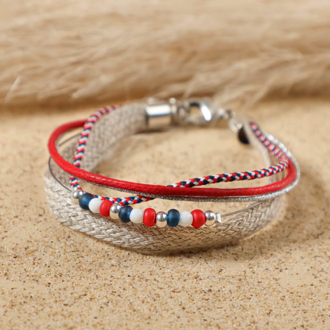 Vivez l’esprit festif et coloré avec le bracelet Cathy. Inspiré par les couleurs vibrantes du bleu, blanc et rouge, ce bracelet multibrins vous plonge dans une atmosphère pleine de vie, de fraîcheur et de liberté. Imaginez-vous flânant au bord de la mer, les vagues en toile de fond, avec ce bracelet, symbole de votre esprit libre et joyeux, orné à votre poignet. Le mélange parfait de matières et de couleurs donne à ce bijou un look dynamique, idéal pour ajouter une touche de gaieté à votre tenue ou à vos soirées entre amis.