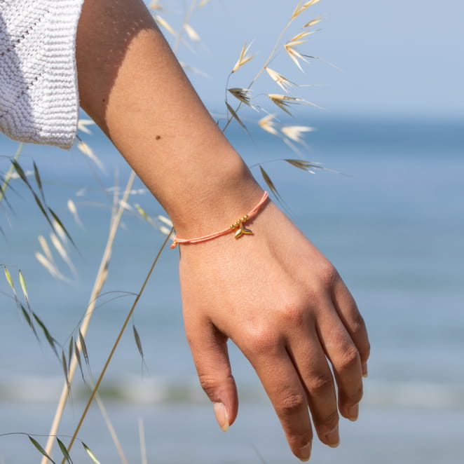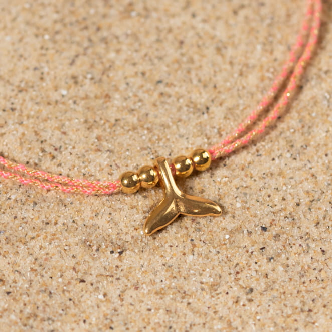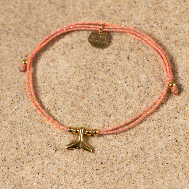 Le bracelet Cétacé pour femme allie élégance et modernité. Son cordon réglable rose est agrémenté d'un pendentif en forme de queue de baleine dorée et de petites perles dorées. Ce bijou délicat apporte une touche de sophistication et de féminité, idéal pour sublimer votre poignet avec style en toute occasion.