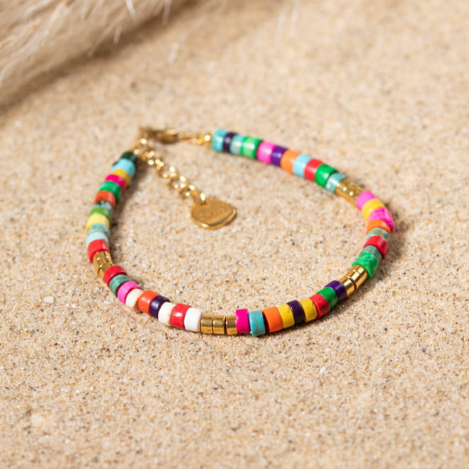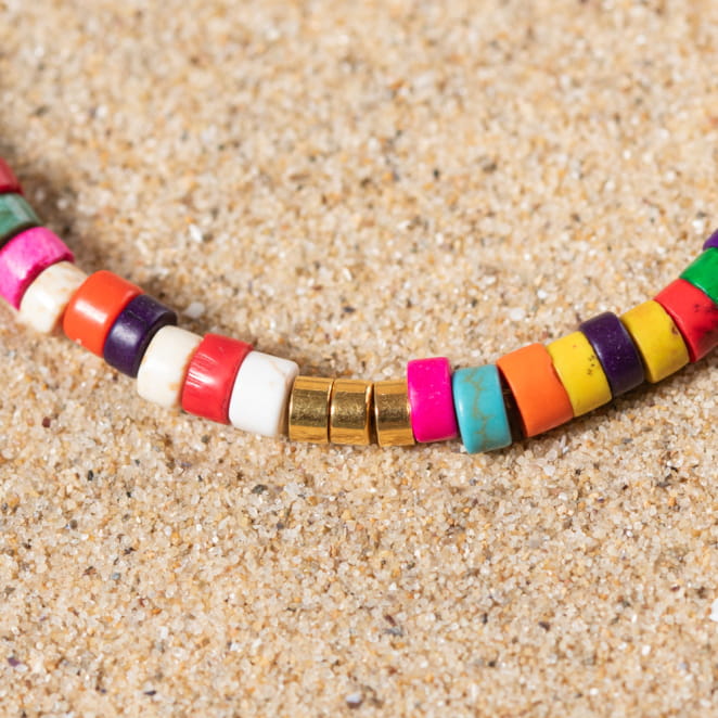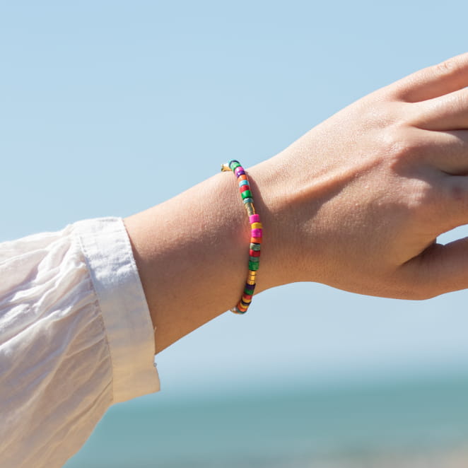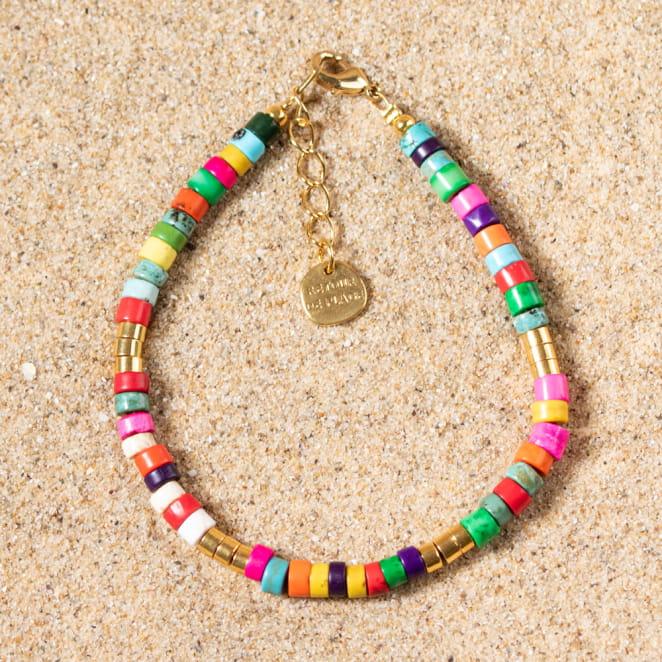 Optez pour notre bracelet Chamarel, un magnifique bijou composé de pierres multicolores en howlite de couleurs très vives. Ce bijou coloré et lumineux vous transporte directement en vacances. Une touche de gaieté pour tous vos looks. Accompagnez-le du collier et des boucles d'oreilles Chamarel, pour un accord parfait !