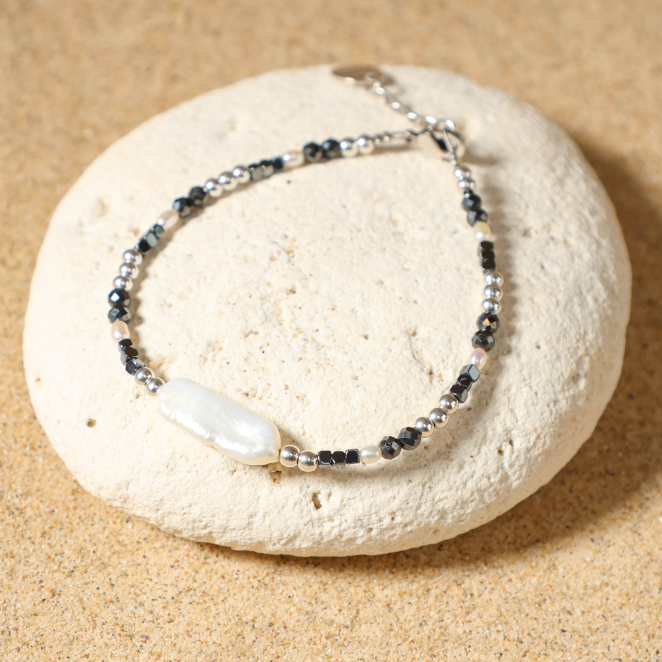 Découvrez le bracelet Chicago ! Ce bijou pour femme composé de perles argentées, nacre, hématite grise et perle de rivière apporte modernité à votre tenue. La nacre au centre donne authenticité à ce bracelet, Chicago est un bijou à porter au quotidien s'harmonisant parfaitement à toutes vos tenues de journée comme de soirée !