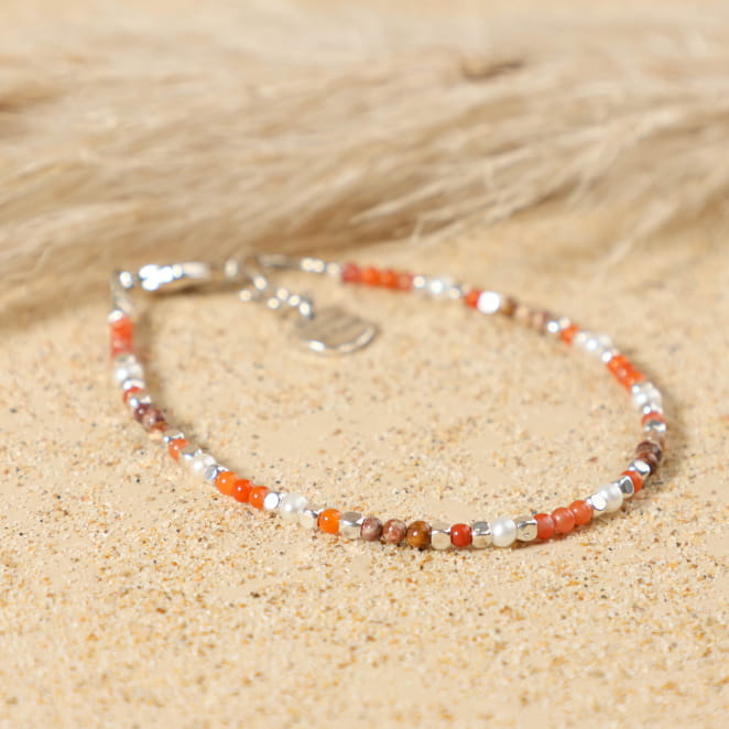 Optez pour le bracelet Collonges, une pièce artisanale qui mêle harmonieusement les tons chauds de la terre et l’éclat des pierres naturelles. Ce bracelet, orné de perles de jaspe marron, de perles de rivière blanches et d’agate rouge, rappelle les paysages minéraux et les reflets du coucher de soleil. Il allie authenticité et douceur pour un accessoire qui accompagne toutes vos tenues.