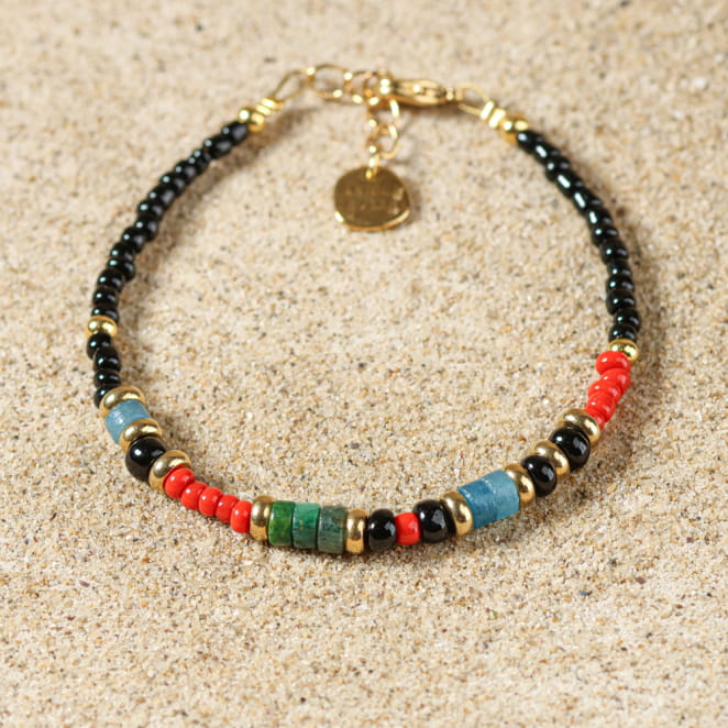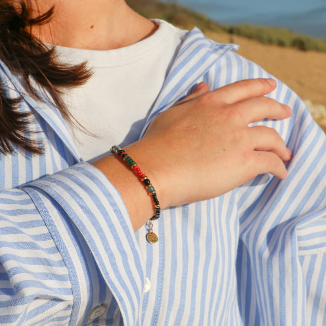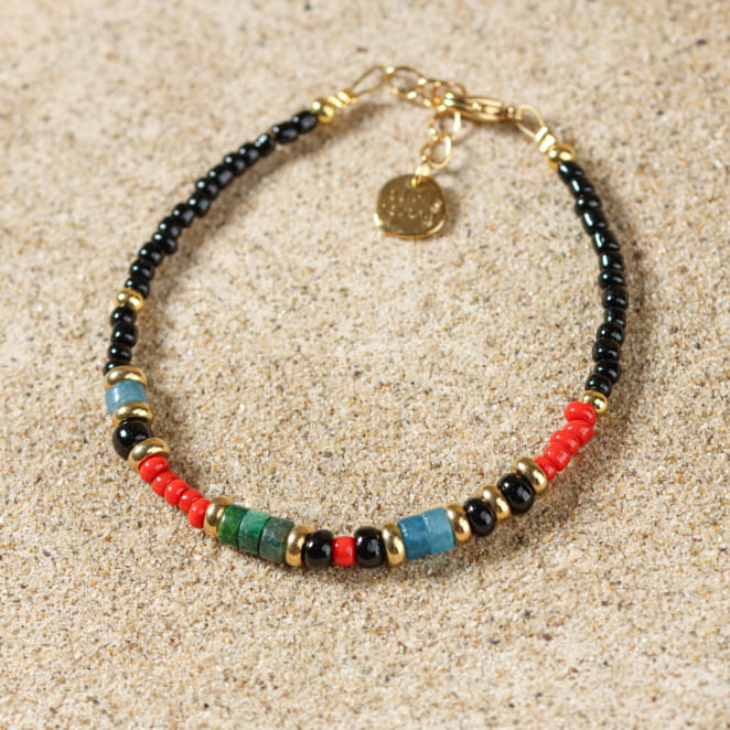 Découvrez le mystère et l'élégance du bracelet Conque ! Plongez dans un univers à la fois profond et envoûtant avec ce bracelet, un bijou aux nuances profondes qui mélange perles de rocaille et pierres naturelles. Chaque détail de ce bijou artisanal est conçu pour apporter une touche de caractère et d'élégance à vos tenues. Le contraste entre les perles noires et les perles rouges évoque la passion et l'énergie. Chaque pierre confère à ce bijou un caractère unique, renforçant son charme mystérieux. Entièrement fabriqué à la main en France, il témoigne d'un savoir-faire artisanal de qualité.