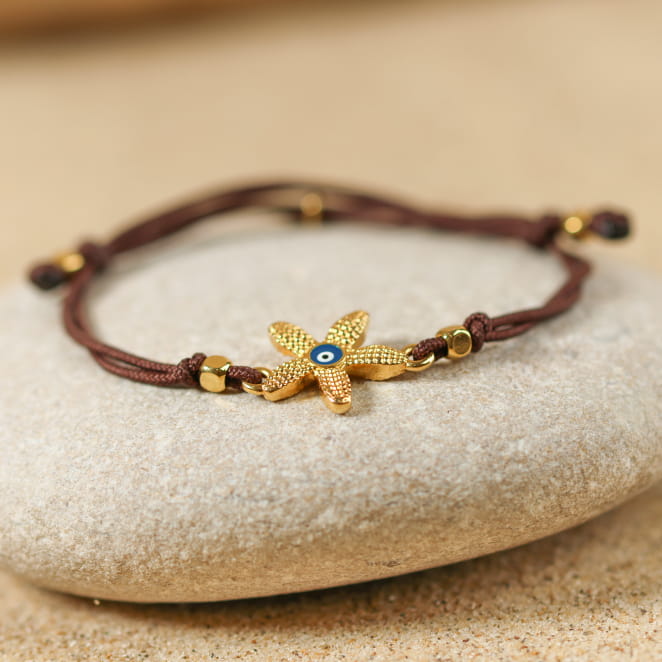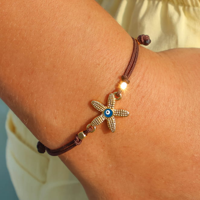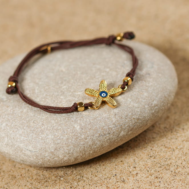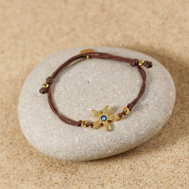 Misez sur un style tendance et facile à porter avec le bracelet Corinthe. Son cordon en polyester marron foncé, réglable pour un ajustement parfait, est rehaussé d’un pendentif étoile de mer doré à l’éclat lumineux, orné d’un détail bleu central qui apporte une touche de couleur subtile. Léger et confortable, il s’adapte à tous les poignets et se porte aussi bien seul qu’en accumulation. Un bijou pratique et raffiné, parfait pour compléter vos tenues estivales ou casual.