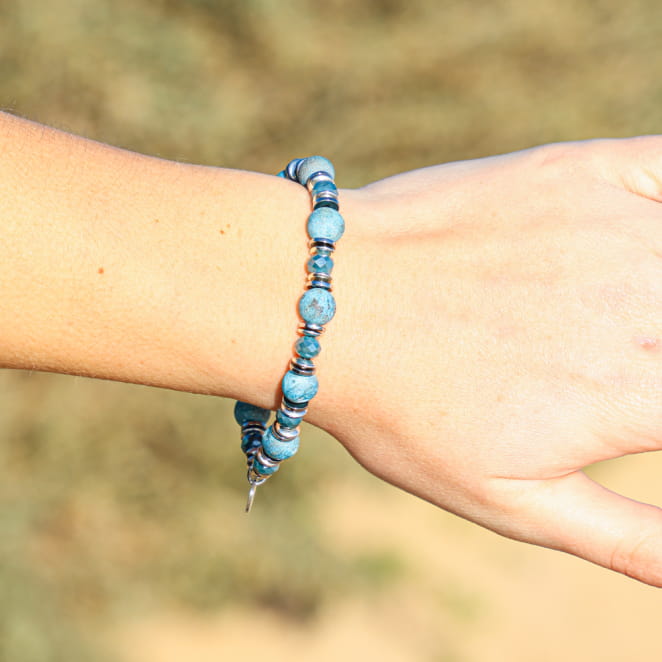 Optez pour notre bracelet Cristobal aux reflets apaisants, où les perles d’hématite argentées se mêlent à l’éclat doux de l’agate bleue et du verre bleu. Avec sa médaille argentée, ce bijou évoque la quiétude des bords de mer et apporte une touche de sérénité à votre poignet. Un accessoire artisanal, parfait pour les amateurs de douceur et d’authenticité.