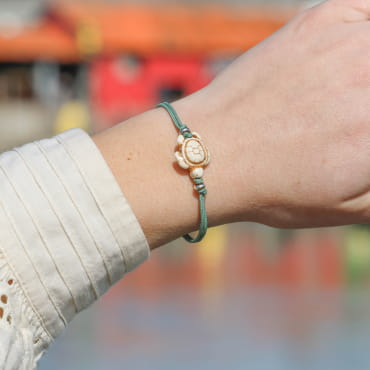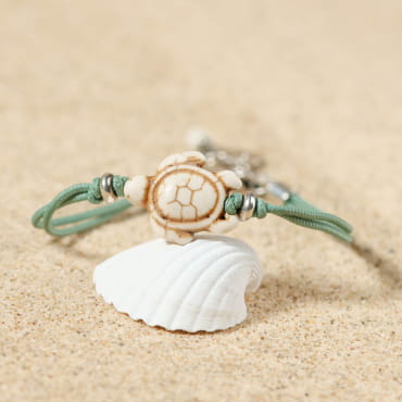 Le bracelet Cuora allie l'élégance à la fantaisie. Des perles d'hématite gris, de jade vert et de métal argenté s'harmonisent, accentuées par une adorable tortue en métal. Un accessoire raffiné qui offre un look fantaisie et classe.